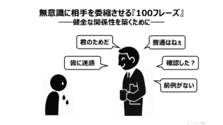 総論 無意識に相手を委縮させる『100フレーズ』――健全な関係性を築くために 無意識に使う言葉が相手を委縮させていませんか? 職場や私生活でよく見られる100のフレーズを集めて、心理学的に解説しました。健全なコミュニケーションを築くための自己点検ツールとして、実践的なリカバリー方法も紹介します。 2025.09.01 総論