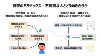 総論 寛容のパラドックス:不寛容な人とどう向き合うか 不寛容な人にどう向き合うべきか。哲学者ポパーの「寛容のパラドックス」と社会心理学者シモンの「不承認-尊重モデル」を基に、威圧的な人や攻撃的な人への具体的な4ステップ対応法を解説。すべてを受け入れる必要はなく、相手を尊重しながら適切な境界線を引く方法を提案します。 2025.09.28 社会総論