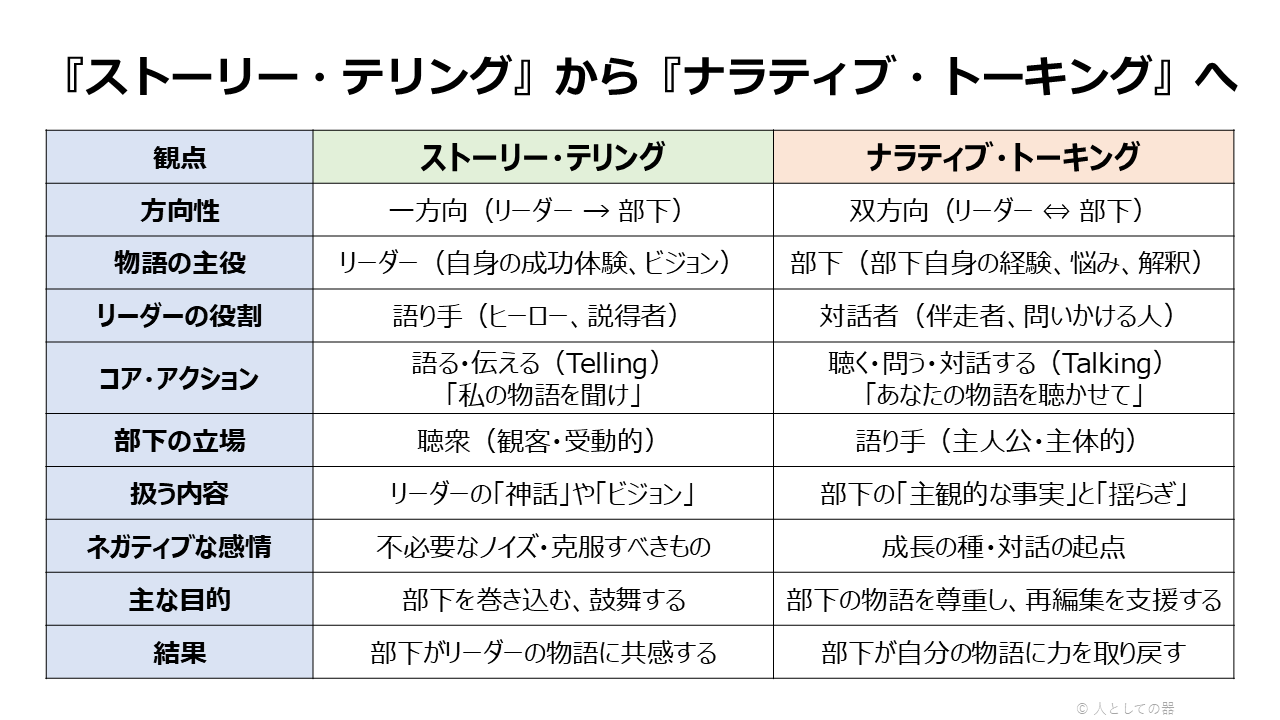 以下、ストーリー・テリングとナラティブ・トーキングの本質的な違いを整理しています。