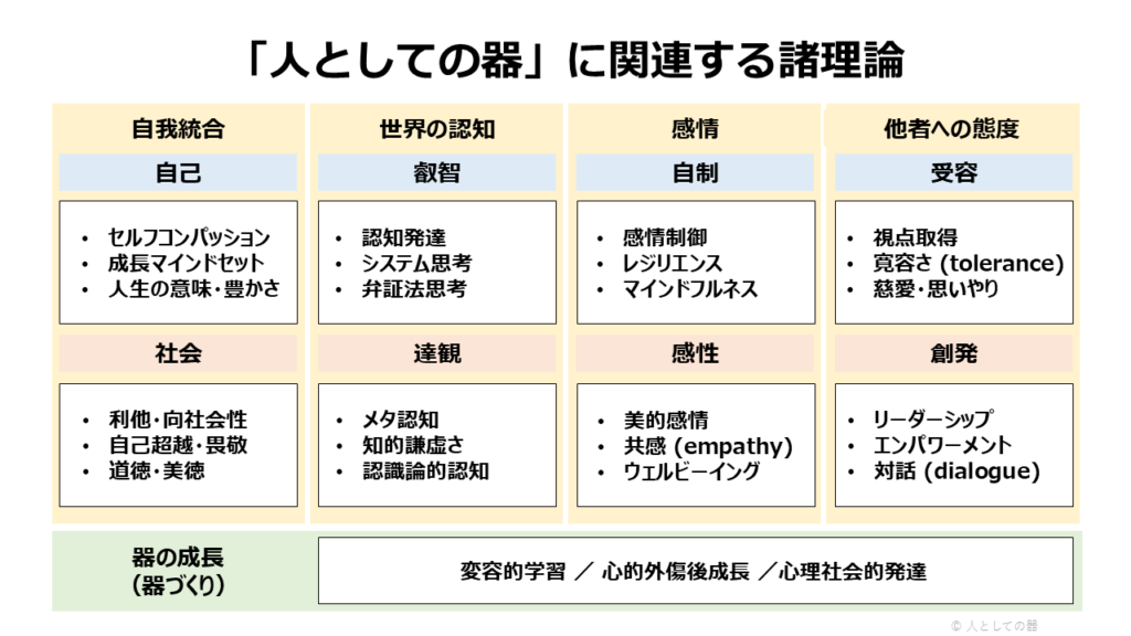 具体的には、感情の自制と感性、他者に対する受容と創発的な関わり、自己と社会への統合、そして世界の認知における叡智と達観という観点から、感情制御、レジリエンス、マインドフルネス、共感、視点取得、リーダーシップ、メタ認知、知的謙虚さなどの心理学的変数を整理しています(詳細はこちら)。