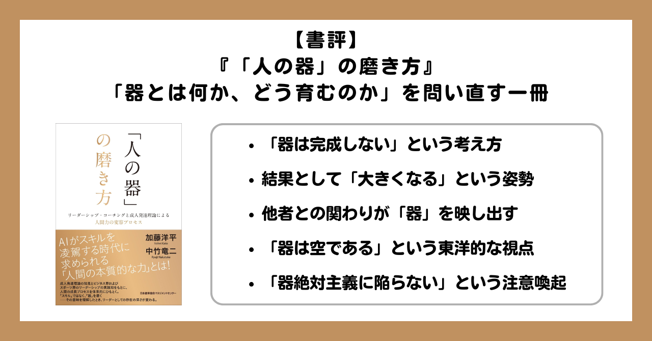 本書は、加藤洋平さんによる成人発達理論やダイナミックスキル理論といった発達心理学の知見と、中竹竜二さんの豊富なリーダー開発・コーチングの実践経験を融合させ、「器」という抽象的な概念に具体的な輪郭を与えようとする意欲作です。