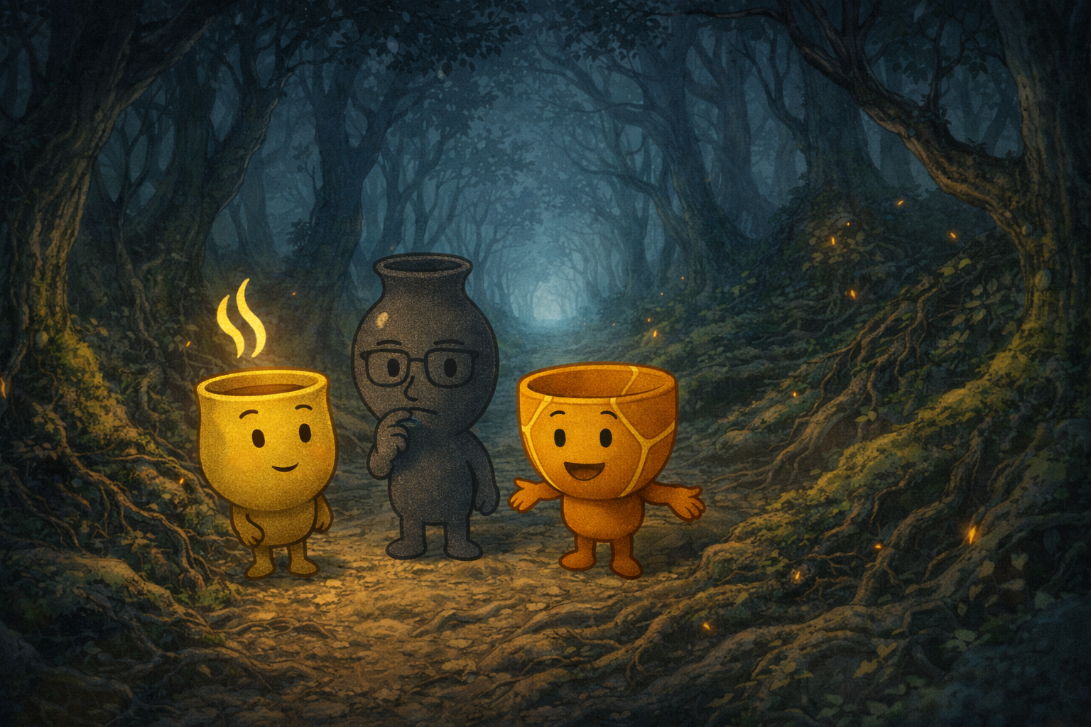 ゆのみんの湯気が震え、つぎっぴーの金の線が、ほんの少し光った。