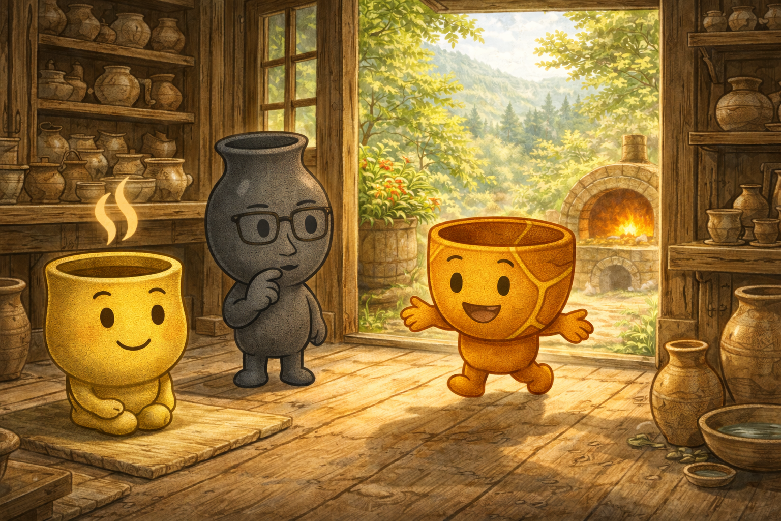 陶房の戸をそっと開けると――すでにゆのみんが座っていた。