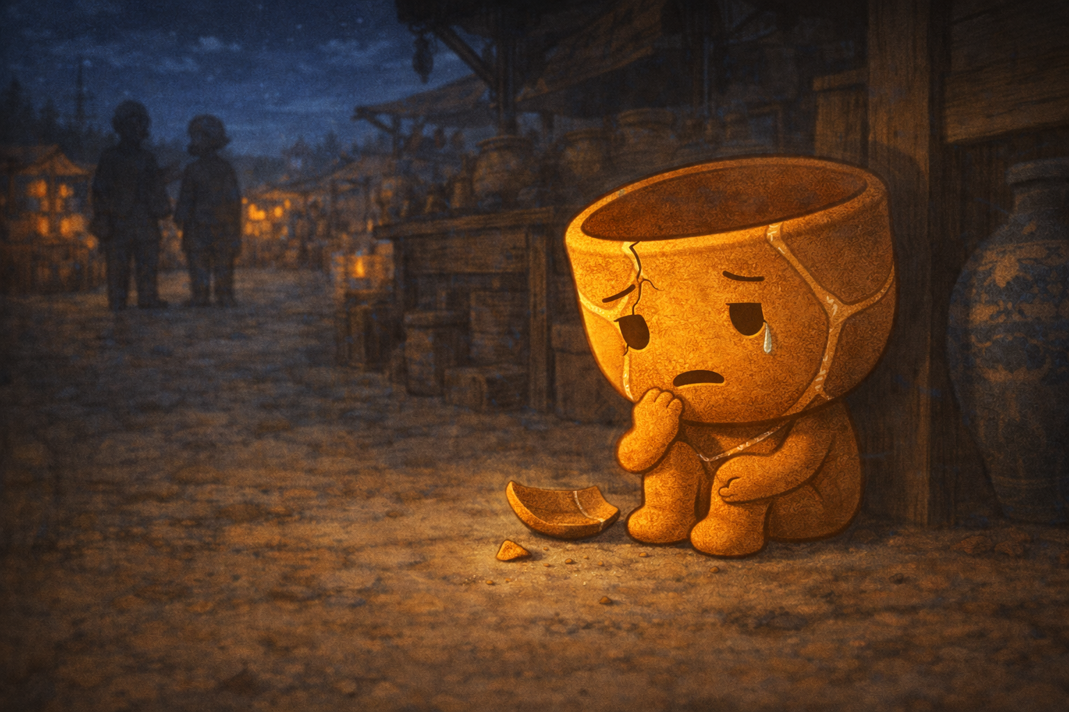 つぎっぴーは、ひとりで傷を抱えたまま、暗い市場の端で震えていた。
