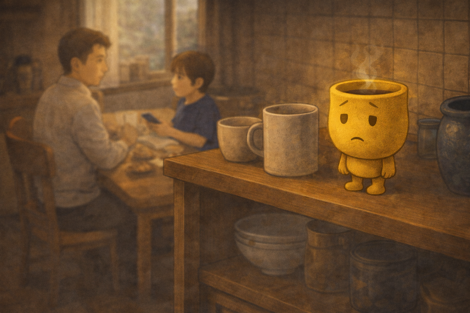 母が別のカップでお茶を飲むたびに、ゆのみんの湯気が静かにしぼんでいった。