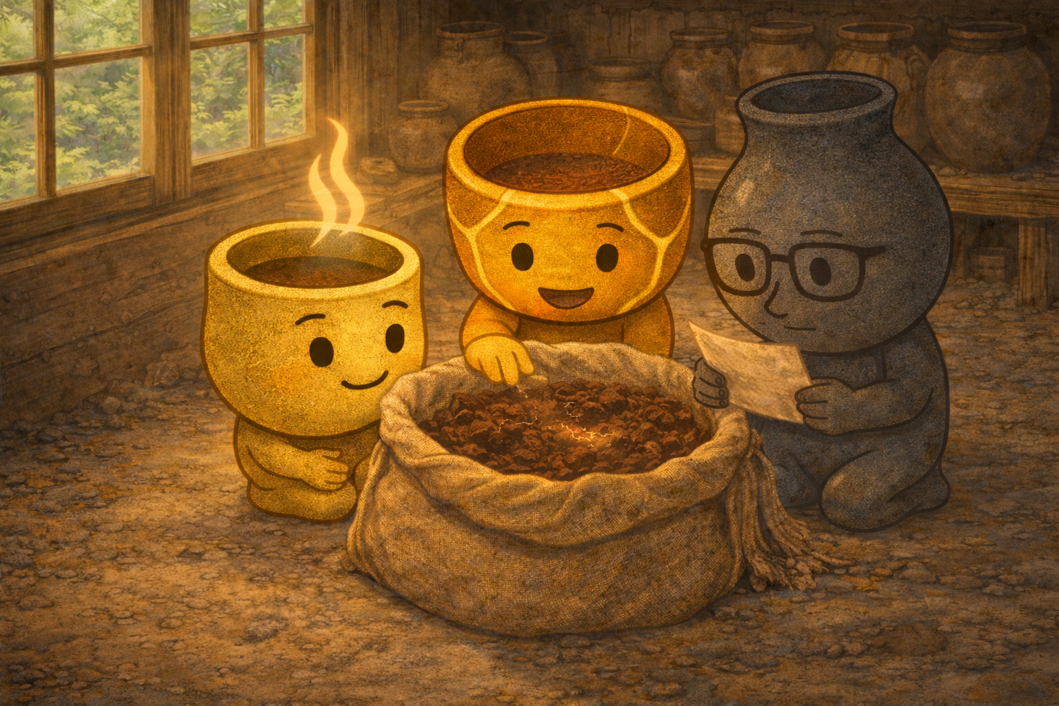 ひとがまの窓から差し込む朝の光の中で、つぼるんは土の袋をそっと広げた。