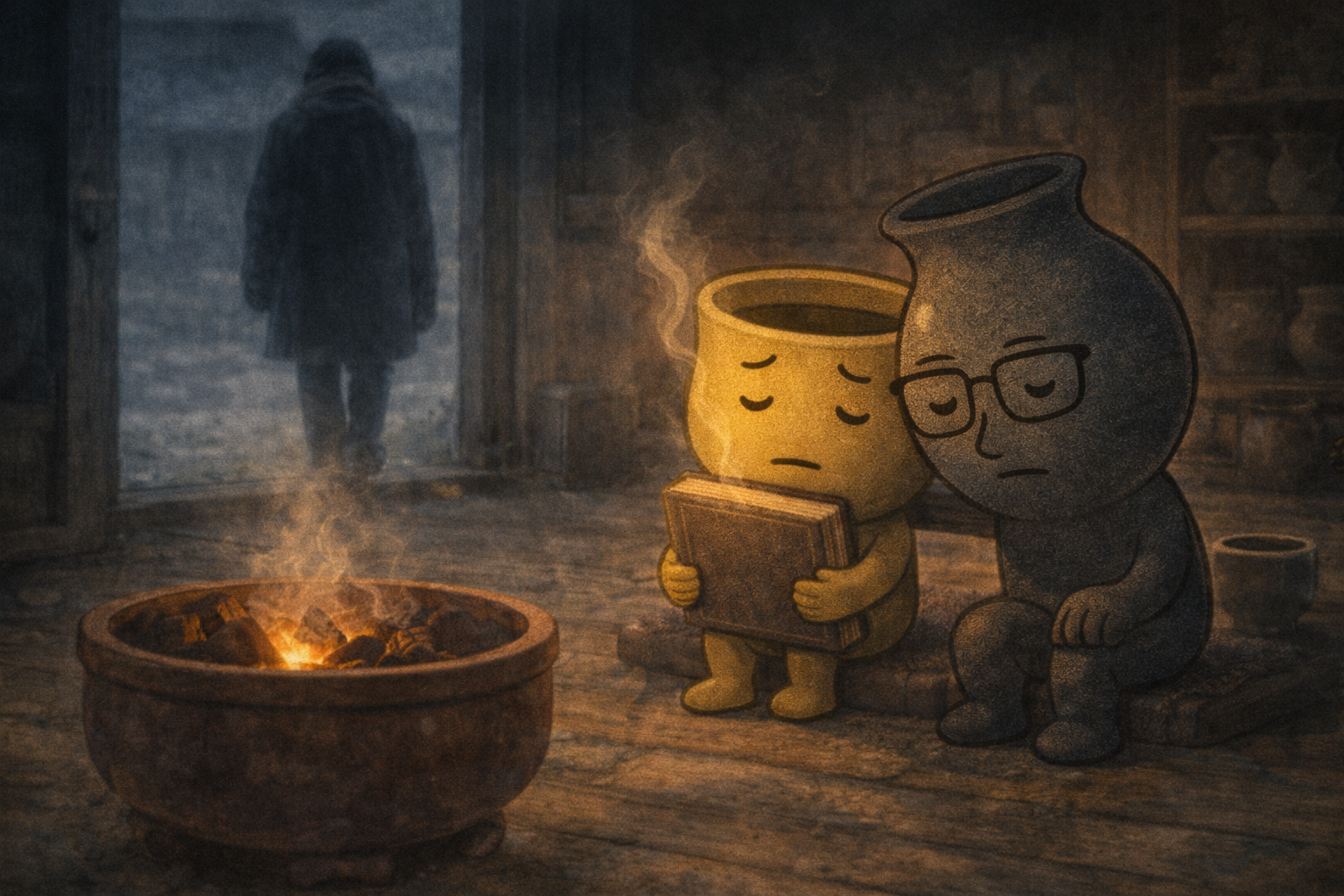 ゆのみんは金継ぎノートを胸に抱えたまま、火鉢のそばで静かに揺れていた。