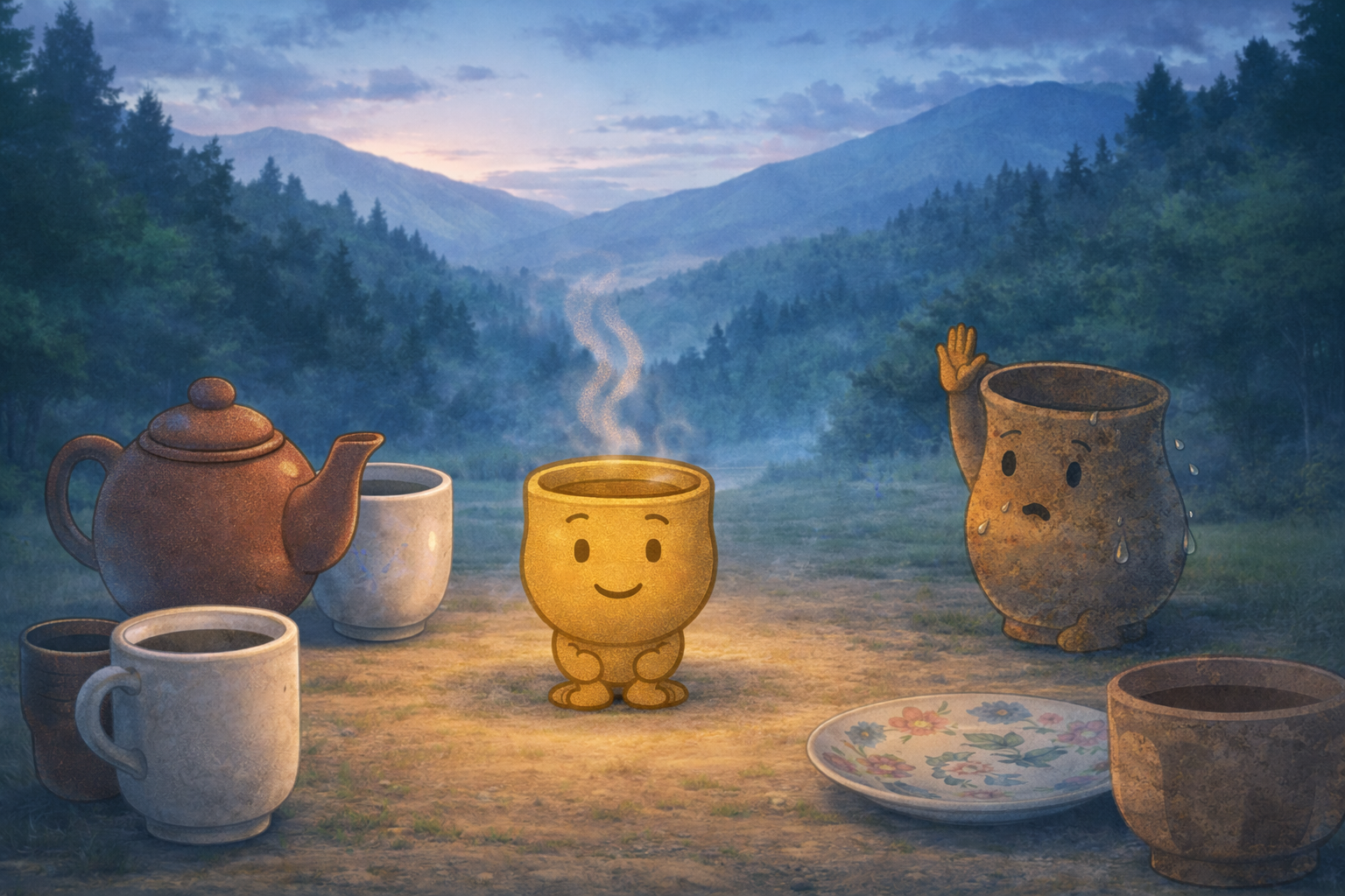 ゆのみんは、昨日の『器物語』の余韻がまだ胸に残っていて、ぽかぽかした湯気をまといながら、ひろばの中央にちょこんと座った。